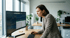 Frau sitzt an einem Schreibtisch vor einem Laptop und blickt auf rote Lieferwagen und LKWs auf einem Hof.