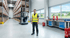 Ein Lagerarbeiter in Warnweste geht mit Klemmbrett durch ein Lager mit Hochregalen und Gabelstapler.